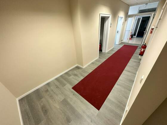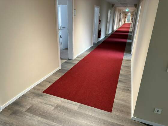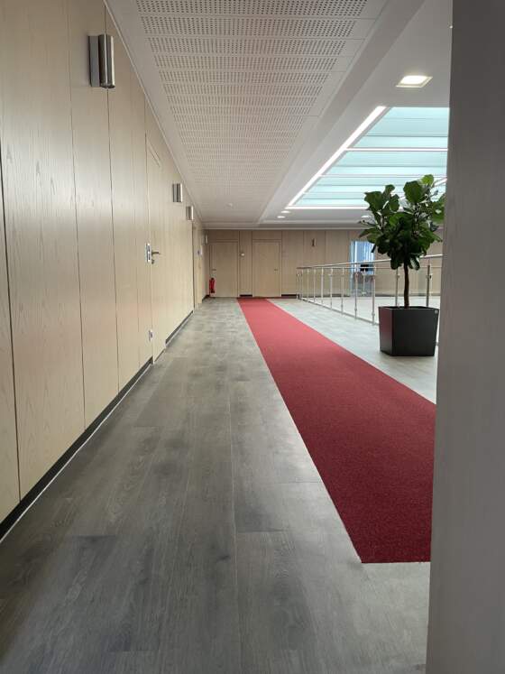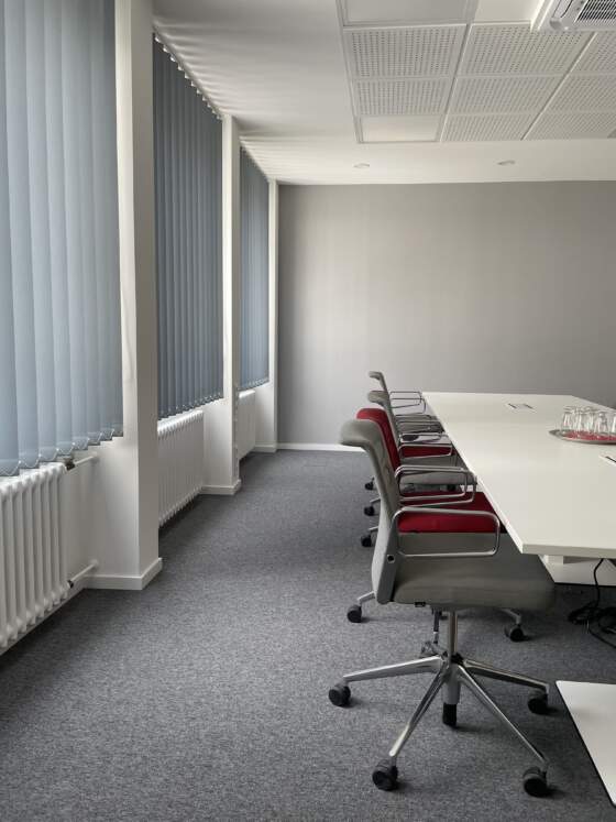 In den Büros und Besprechungsräumen wurde ein strapazierfähiger Textilbelag von Infloor Girloon im Plankenformat (Artikel Cover Vario) verlegt, der Komfort und Langlebigkeit vereint. Ergänzend lieferten wir für die Räume maßgefertigte Vertikallamellenanlagen von MHZ, deren Rückseiten mit einer Hitzereflektionsschicht ausgestattet sind – ideal für Sonnenschutz und Raumklima.