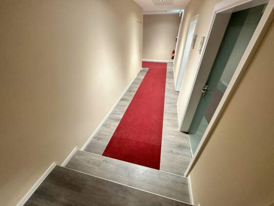 erhielten einen hochwertigen LVT Designbelag von Amtico (Kollektion Spacia). Als gestalterisches Highlight wurde mittig ein Laufbereich mit Schlüterschienen abgegrenzt, in den auf gleicher Höhe ein roter Teppichboden von Interface (Artikel Heuga) eingearbeitet wurde – farblich perfekt abgestimmt auf das Sparkassen-Logo.