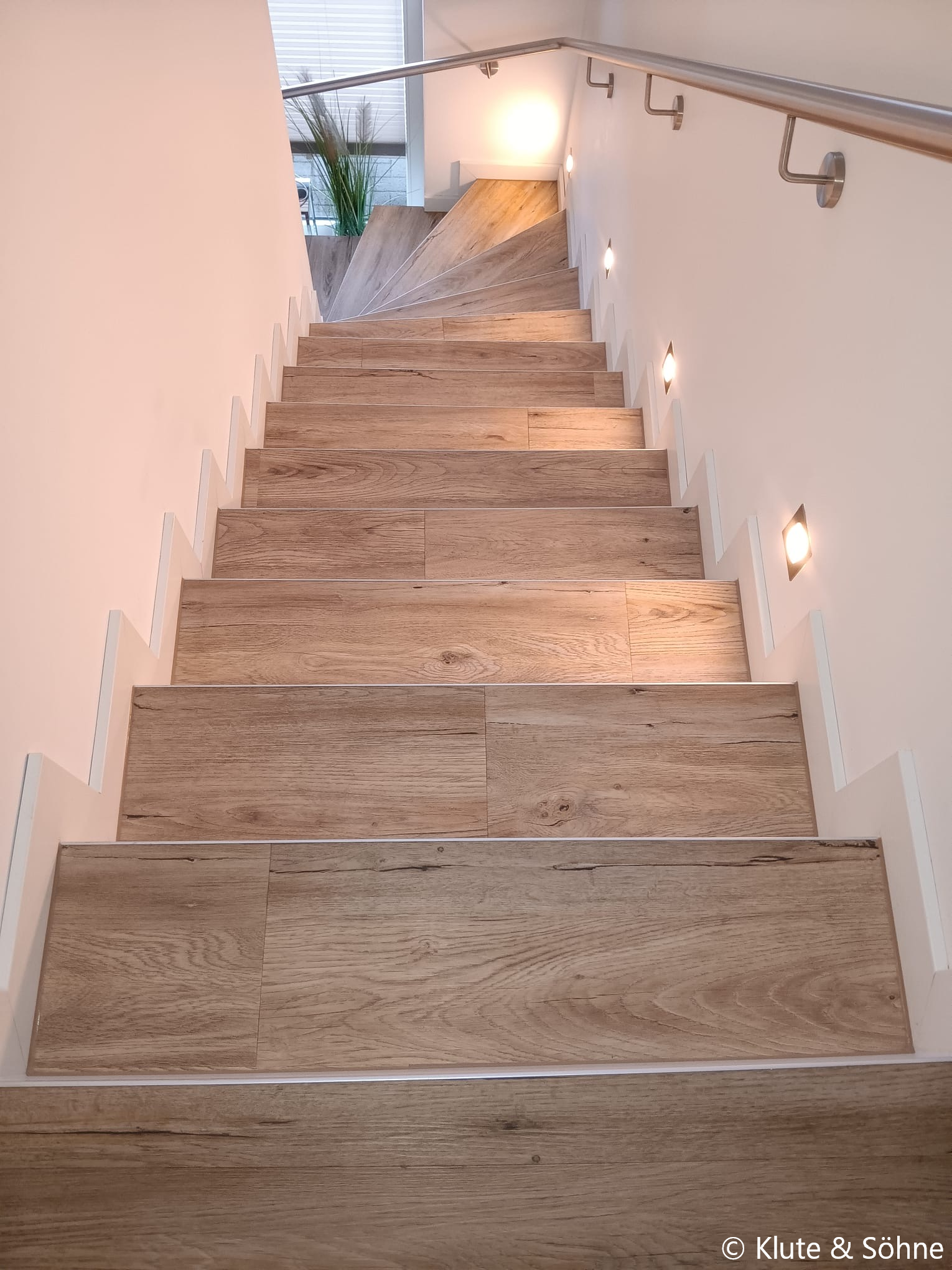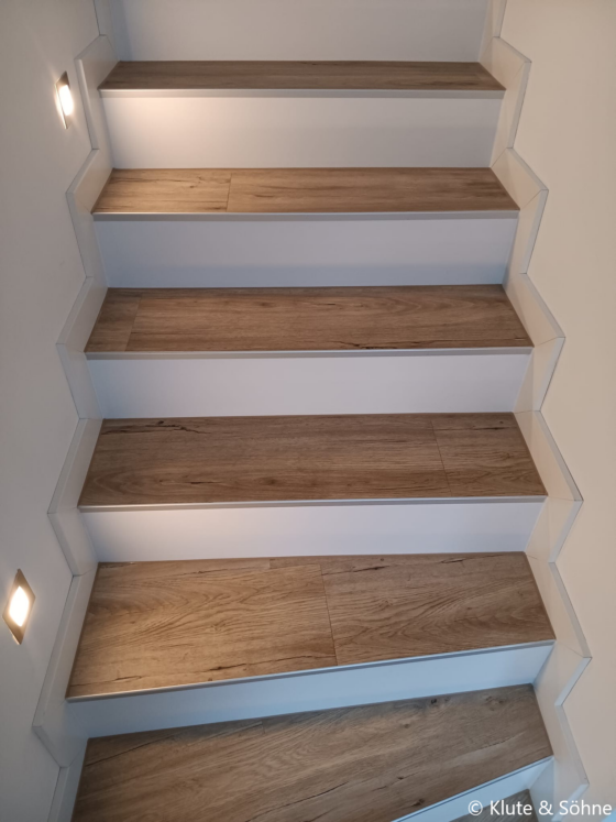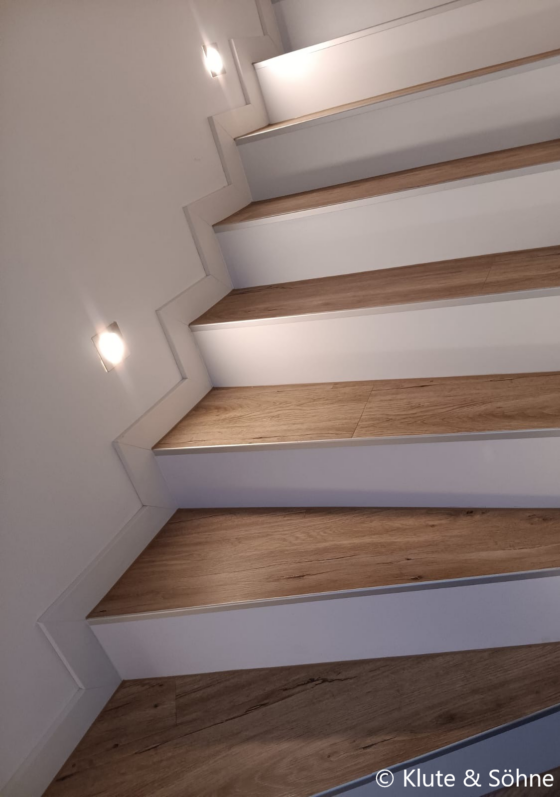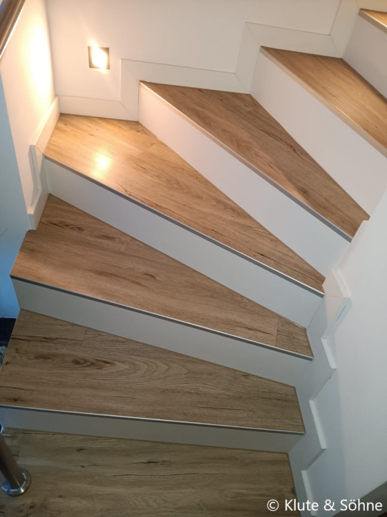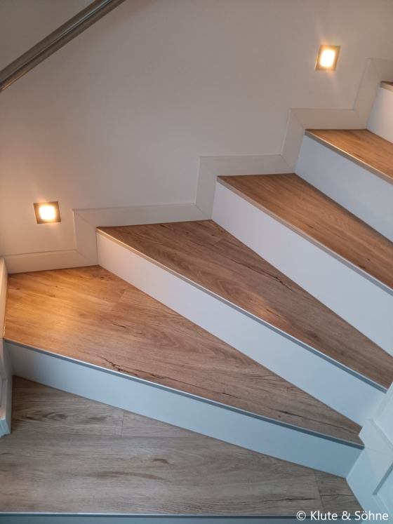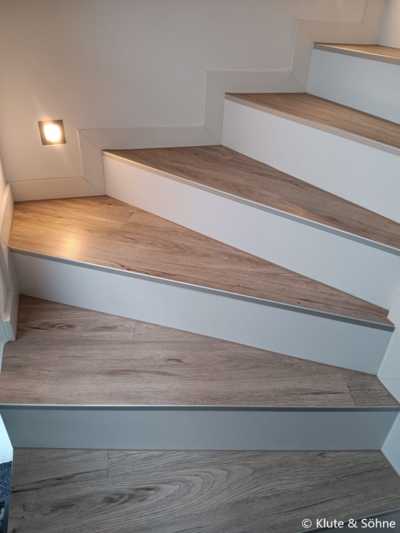 Im Privathaus wurden 17 Trittstufen mit PVC-Planken beklebt. Dazu wurden die Stoßstufen grundiert, gespachtelt und mit weißen MDF-Platten beklebt. Anschließend haben Klute & Söhne Holzfußleisten montiert.