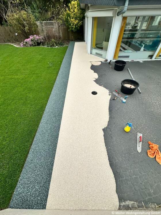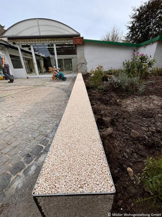 setzten wir Steinteppich auf einer alten gepflasterten Terrasse sowie im Wintergarten um. Die Böden wurden in den Farben Botticino