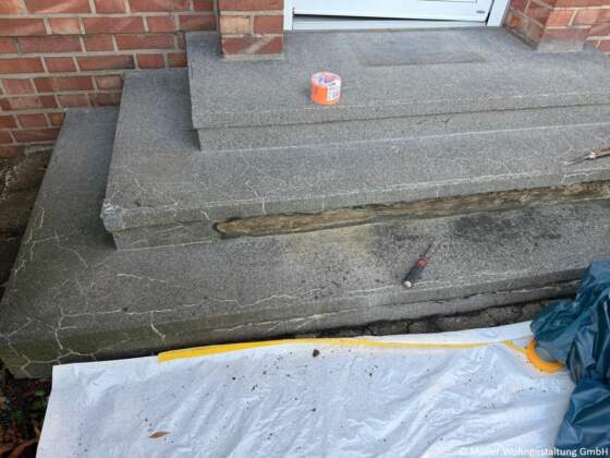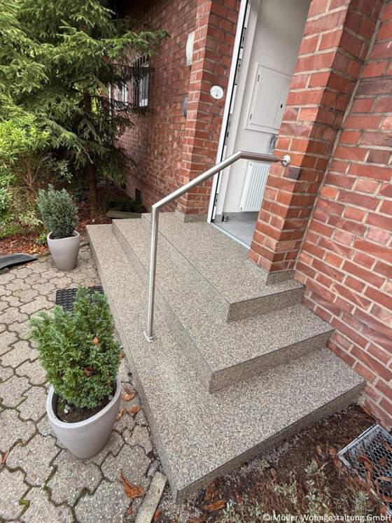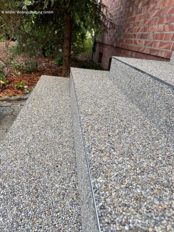 wurde eine alte, teils defekte Steintreppe neu gestaltet. Nach sorgfältiger Grundierung und Montage von Winkelschienen verlegten wir einen strapazierfähigen Quarzkiesboden von Quarzkiesboden Zimmermann, der der Treppe ein frisches, modernes Erscheinungsbild verleiht.