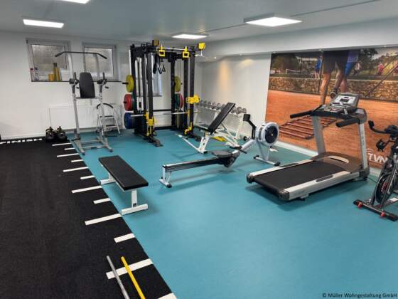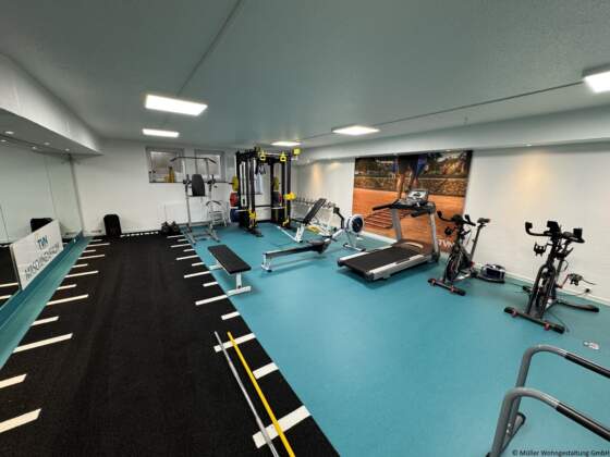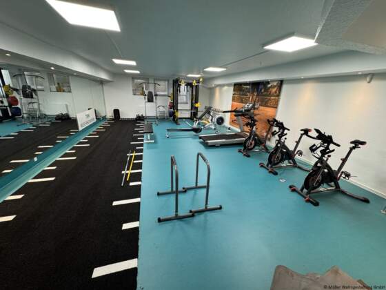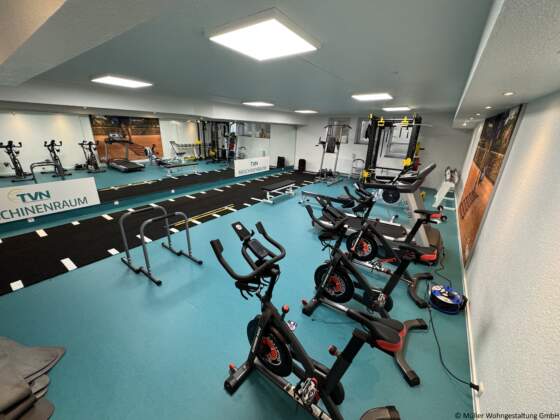 In den Büros, Fluren und Besprechungsräumen verlegten wir Vinylboden von Gerflor (Creation 55, Farbe Swiss Oak Pearl) – eine elegante und strapazierfähige Lösung für stark frequentierte Bereiche. Im Fitnessraum wurde auf 80 m² Linoleum von Gerflor DLW Marmorette Acoustic in der Farbe Curacao Petrol zurückgegriffen, passend zum Farbton des TVN-Logos.